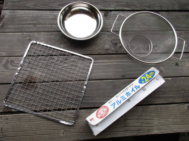 用意したのは七輪と段ボール箱、100均で買ったザルと網とプレートとアルミホイル。