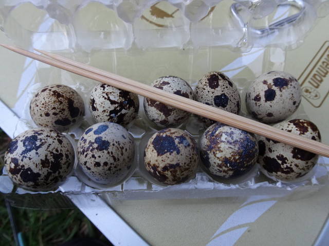 春日部の「福島や」で食べた、殻付きウズラの玉子の串焼をやってみました。