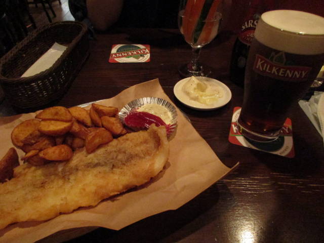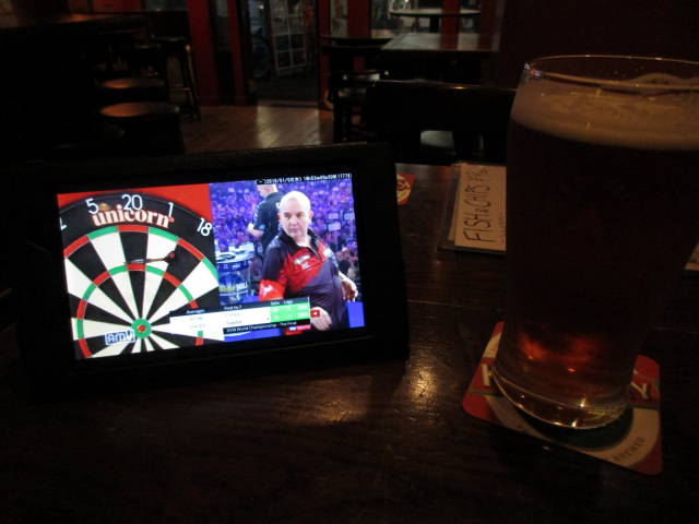 タブレットでダーツを観ながらバスペール、その後にスティックサラダとフィッシュ&チップスで、キルケニー。