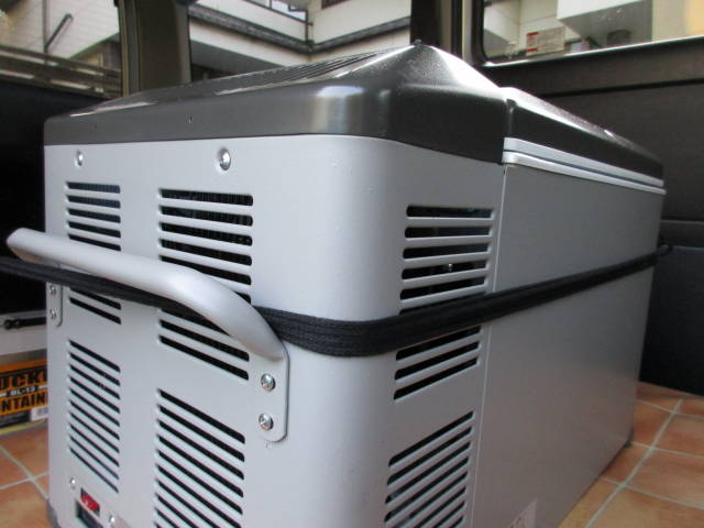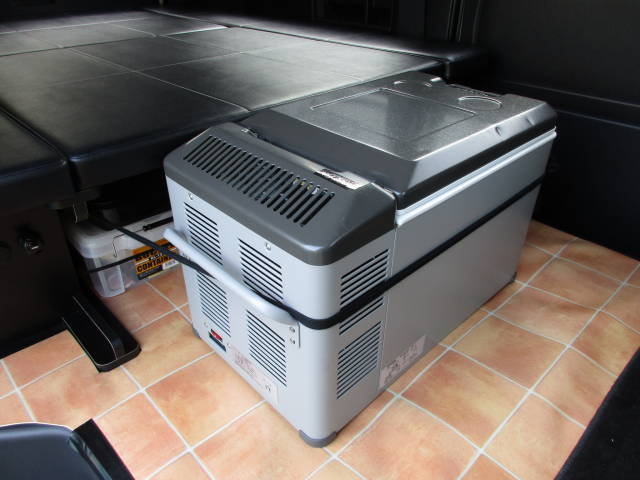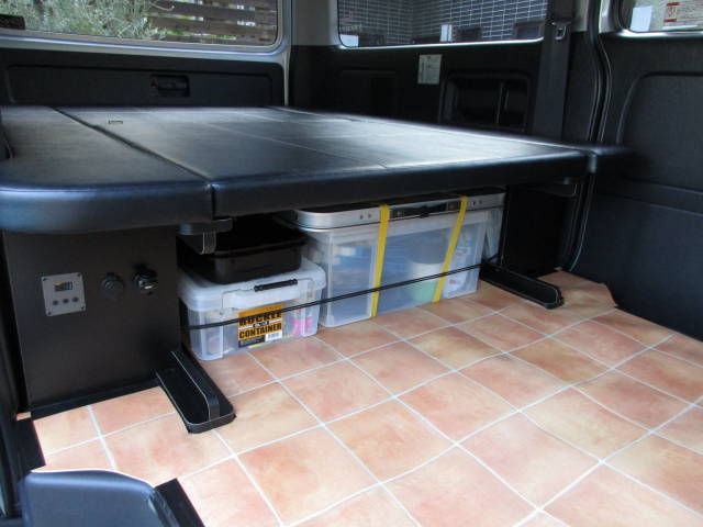 少し強めにブレーキを踏むと、ベッド下に積んだコンテナが前へ滑り出るように。そこで、木ネジを打って、ケーブルしばり紐でガード。