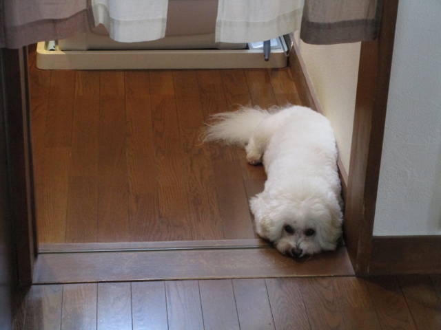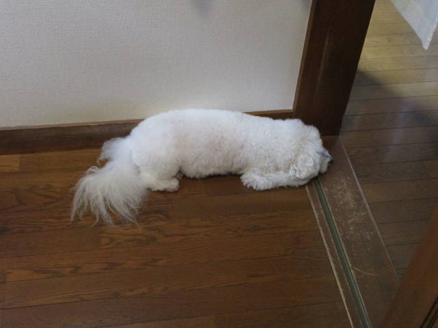 歯を磨き始めると、必ずクレア♀がこんな風に洗面所の入口にやって来て、外へ向かって座ります。