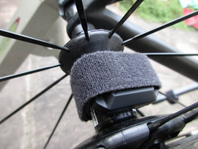 ケイデンスセンサーはクランクに、スピードセンサーは後輪のハブに、附属のゴムバンドで固定。