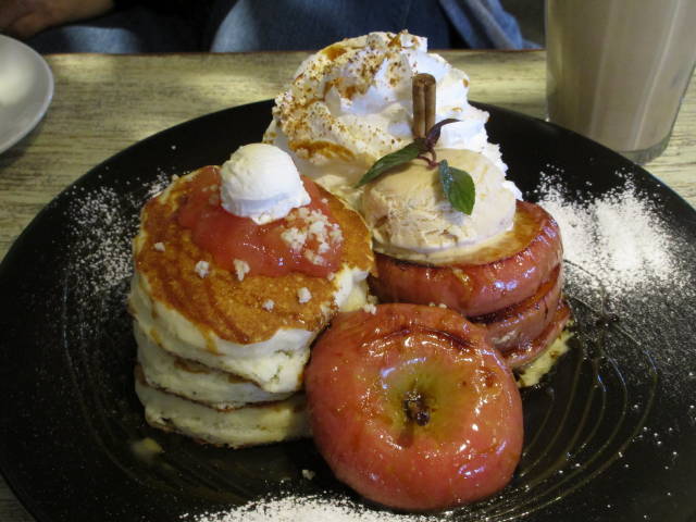 カミさんはアイスマカデミアコーヒー@486円と、アップル塩キャラメルパンケーキ@1706円を発注。