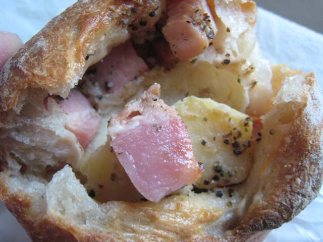 中身はスパイスが効いた、大きなベーコンとポテト。ビールにもハイボールにも、相性抜群なんです!