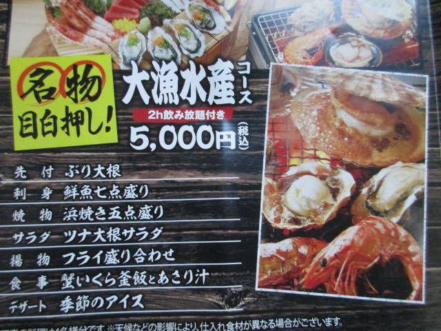 大漁水産コース(飲み放題付き)@税込み5000円を発注。