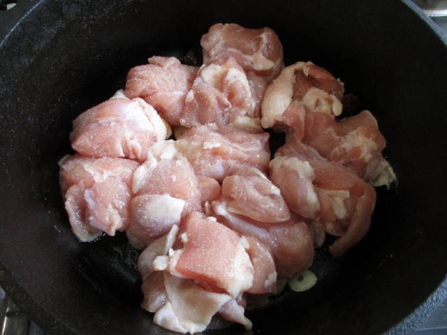 早速シーズニングしたダッチオーブンで、「鶏肉のアヒージョ」を作ってみました。