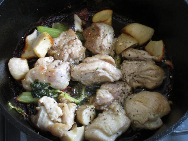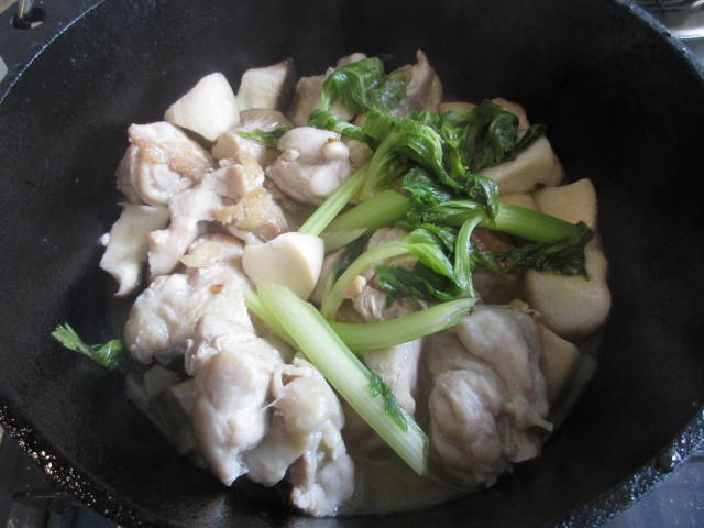 3.火を消して1分後に蓋を開けたら、鶏肉をひっくり返してエリンギとセロリを入れて蓋をして、弱火で8分。