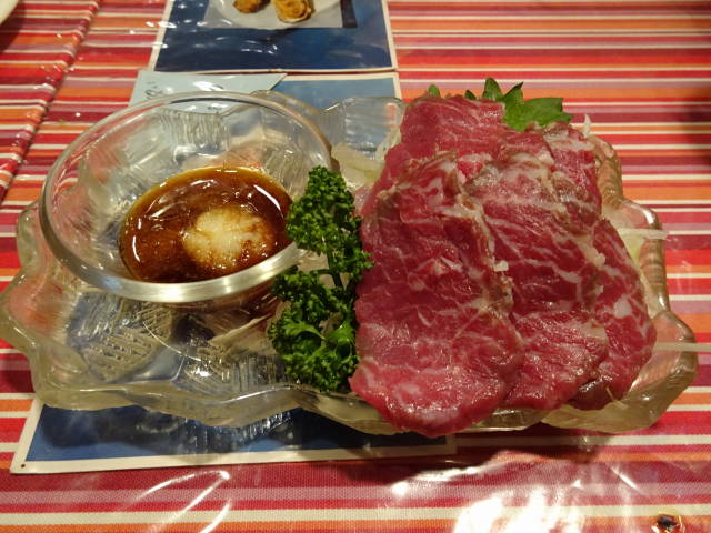 馬刺し、カキグラタン、ステーキサラダ。