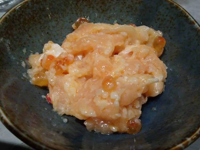 サーモンの塩辛をアテに、店主オススメの日本酒飲み比べセットを堪能。