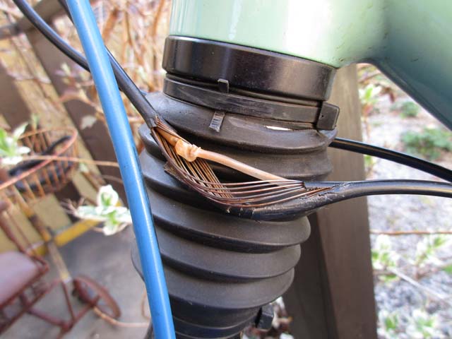 ところが、リアは問題なかったけど、フロントがアウターにシフトしない! 「これも固着か?」と思ってよく見たら、カバーが裂けて伸びたワイヤーが剥き出しになってる箇所が。