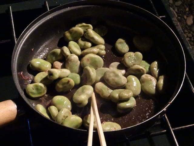 まずは、冷凍そらまめ(業務スーパーで購入)の、アンチョビ炒め(100均で購入)。