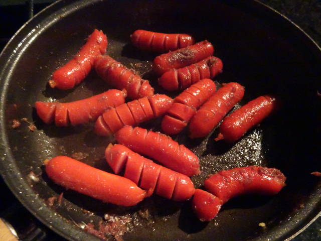 もう1品、赤ウインナー(業務スーパーで購入)の、アンチョビ炒め。