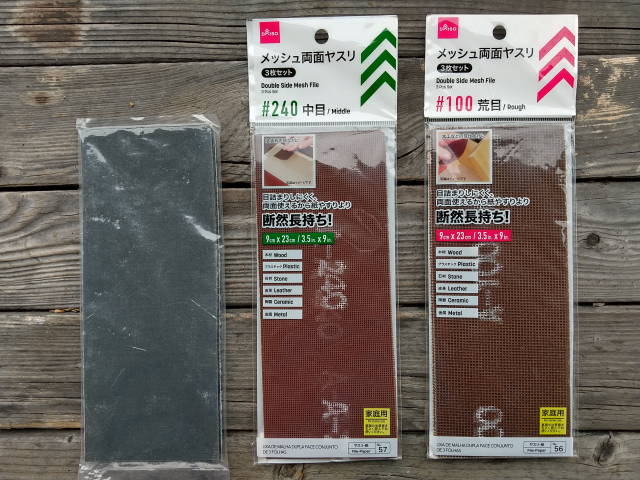 左は先月購入した電動サンダーに付属していた布ヤスリ、右はダイソーで買った、同じ大きさのメッシュ両面ヤスリ3枚入り@110円。