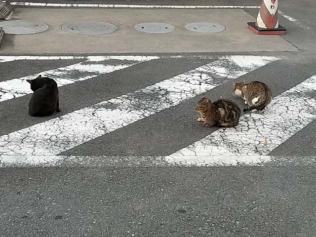オシッコタイムで寄った公園のトイレ前で、3匹の野良猫が会議中。