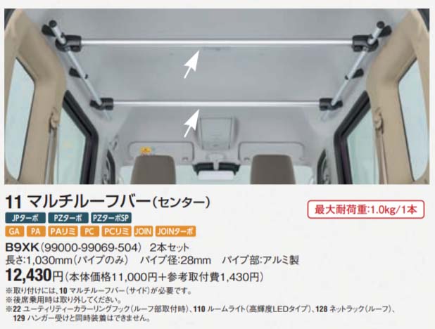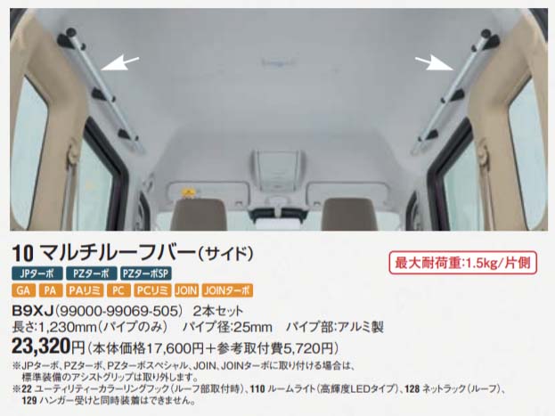エブリイの室内用マルチルーフバーの純正品は、サイドだけで23320円。