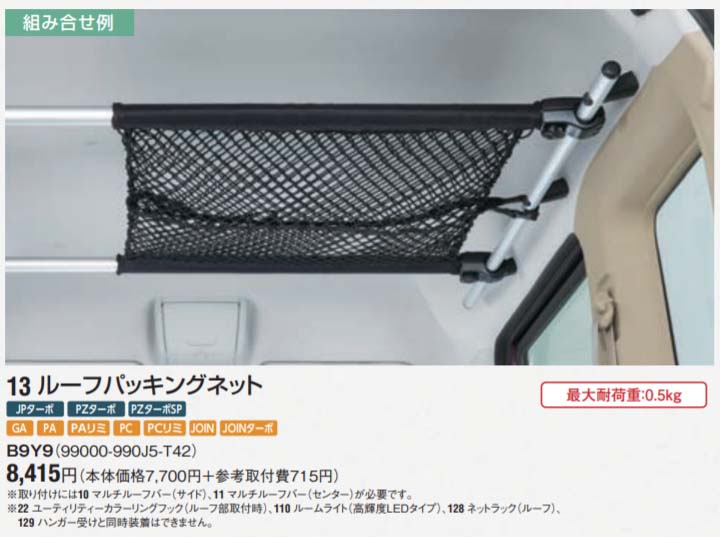 マルチルーフバー(センター)と、ルーフパッキングネットの純正品は、両方で20845円。