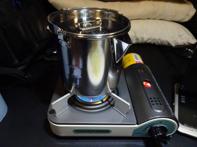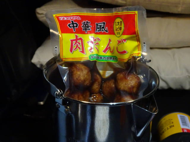 前回の楽天スーパーセールで買った、カクセーのステンレスケトルを使って、レトルトの肉だんごを湯煎。