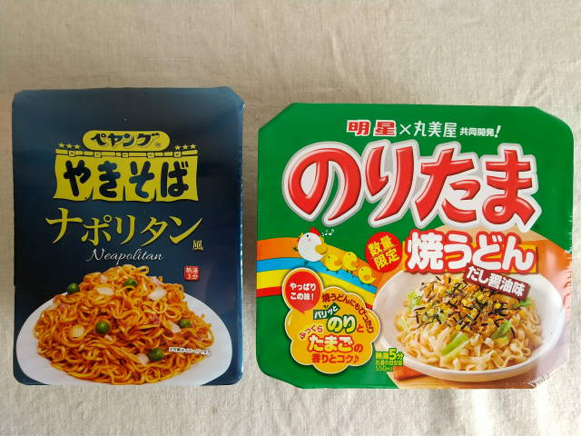 いっぱい惹かれる商品がある中、ペヤングやきそばナポリタン風@確か150円くらいと、のりたま焼うどん@確か120円くらいを購入。