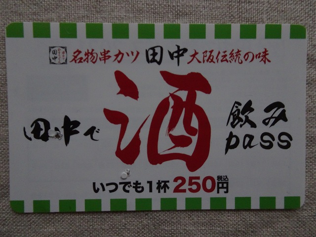 先週末「串カツ田中」へ行った時、「アルコールを3杯以上飲むなら、こちらを購入した方がお得ですよ」って言われたのが、田中で酒飲みpass@550円。