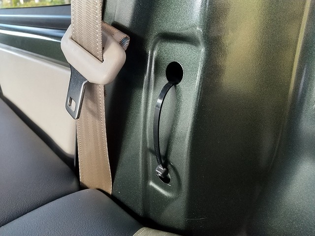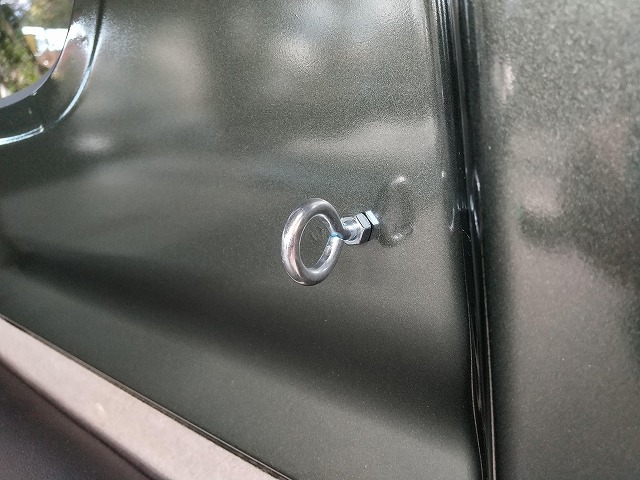 後ろは既設のネジ穴にアイボルト、前にはネジ穴がなかったので、上下穴に結束バンドを通して固定用ベルトに。