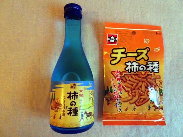 前回の車中泊旅行時に買った、吉乃川酒造の「柿の種に合う日本酒」と、元祖浪花屋の「チーズ柿の種」。