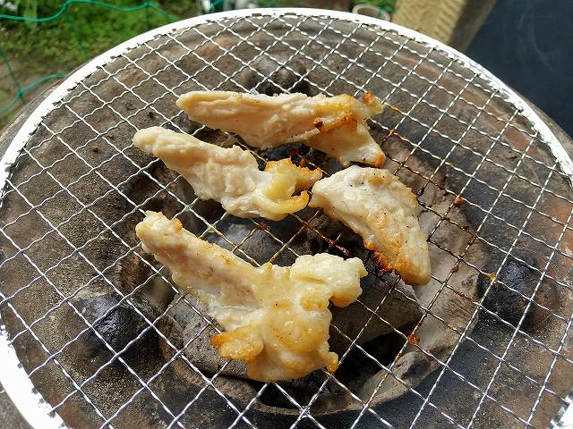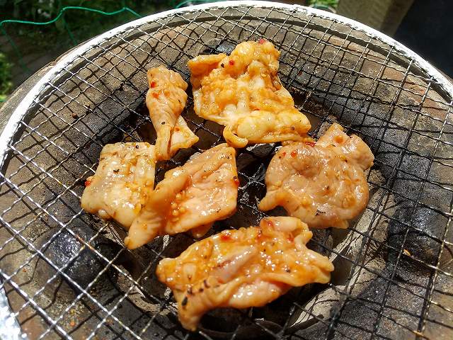 先日の日曜日に「肉の駅」で、鶏軟骨と豚肩ロースとホルモンを買って、ウッドデッキでひとり焼肉。