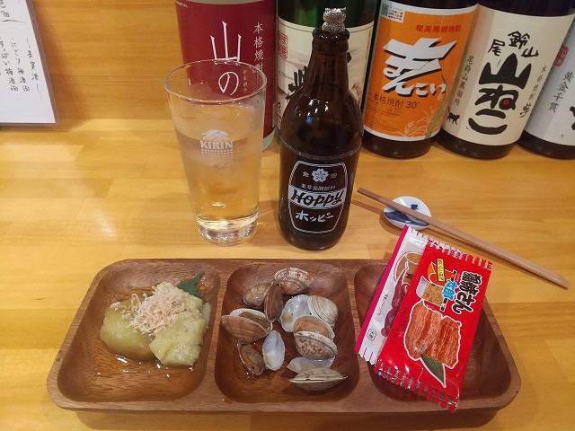 ホッピーは、通常ナカ×3〜4でソト1本だけど、ここはナカ×2でソト1本と、焼酎大盛り、イカの丸干しも〇。