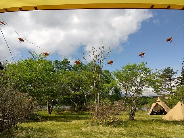 オガワの「カーサイドリビングDX」を手持ちのポールで自立させて、タープとして使用。