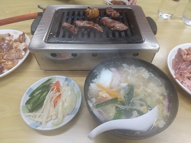 ホルモン・ハツ・カシラ・レバー・ガツ・お新香・玉子スープ・ビール×2で、計4950円也。