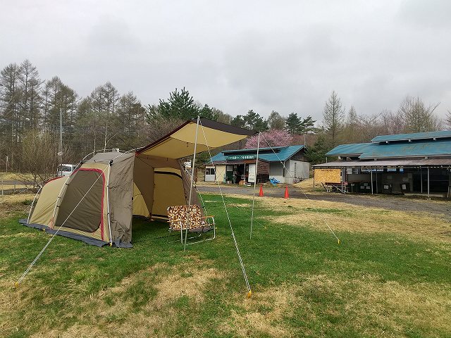 このキャンプ場は予約不可の早い物勝ち、チェックイン時間の規定もなし。GW初日、絶対混むに違いないので早朝に家を出て現地着7時過ぎで先客が1組、場内の移動距離が少ない管理棟近くに設営。