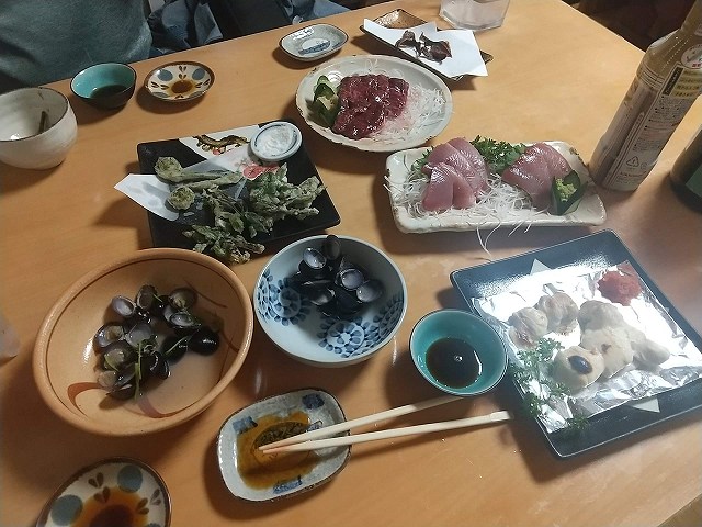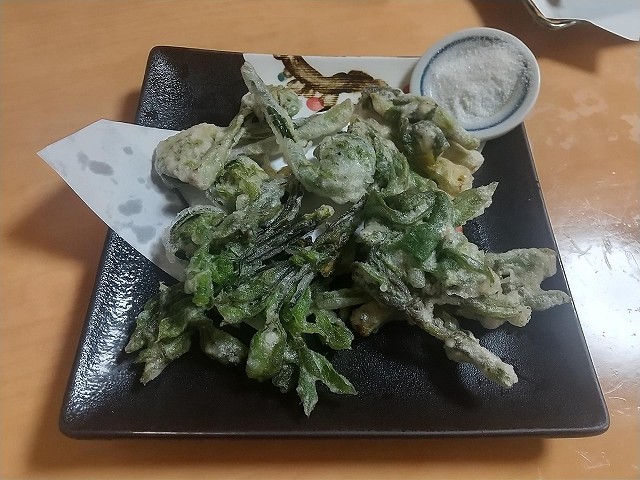 山菜天、ホタルイカ一夜干し、しじみむし、めじ鮪、鯨尾肉、ふぐ白子、最後に〆の蕎麦。