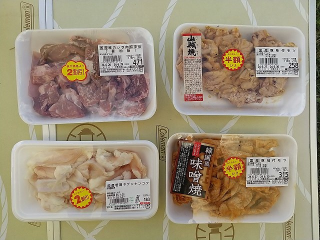 昨日現場から事務所へ戻る途中で「肉の駅」に寄ったら、ホルモンが半額、豚カシラと鶏ナンコツが2割引きに。
