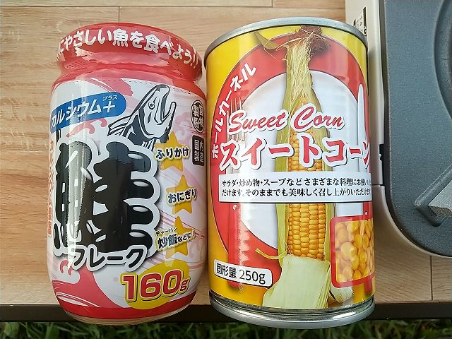 台湾まぜそばの素と野菜炒め、ハーブフランクフルト、スイートコーンと鮭フレーク炒め、他に餃子と鯖。