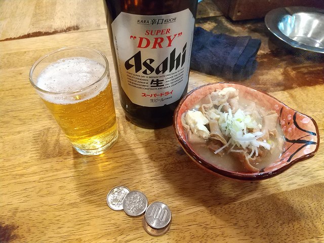 瓶ビール(490円)+もつ煮(200円)×2で計890円也。