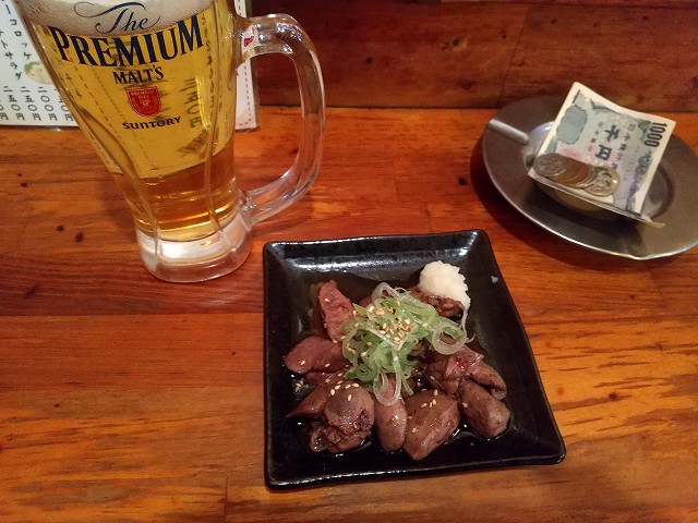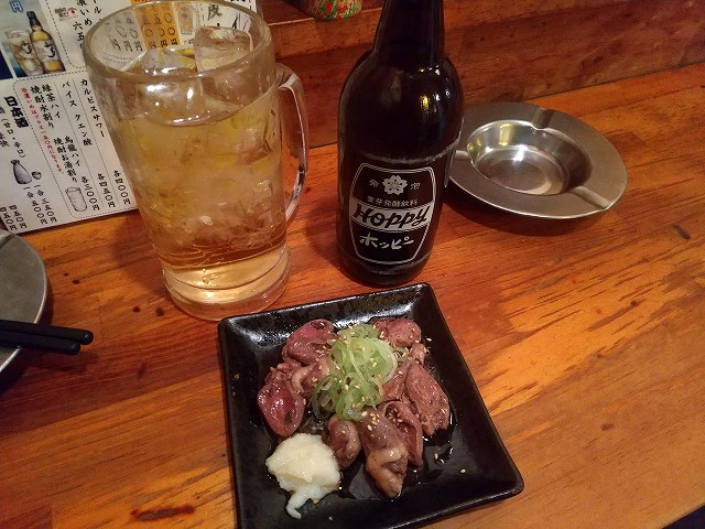 生ビール(450円)+レバテキ(450円)+鶏皮フライ(100円)+ホッピーセット(450円)+ハツテキ(500円)+中(250円)で計2200円也。
