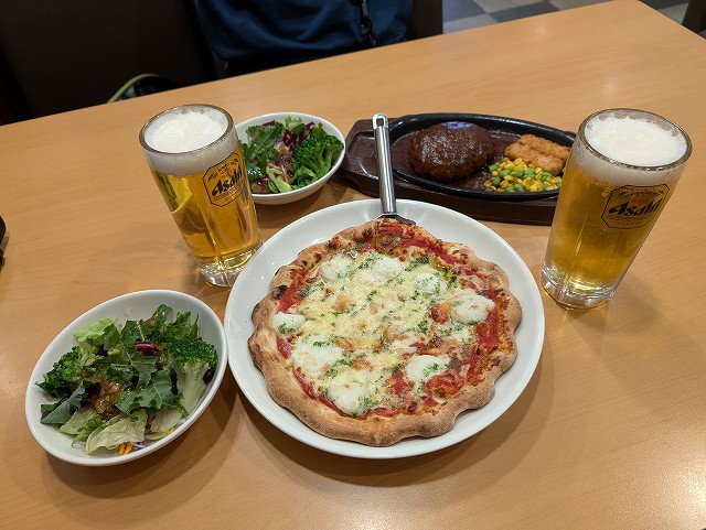 ガストは半額クーポンで生ビールとチーズインハンバーグとピザ、その他サラダ等も。