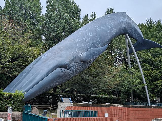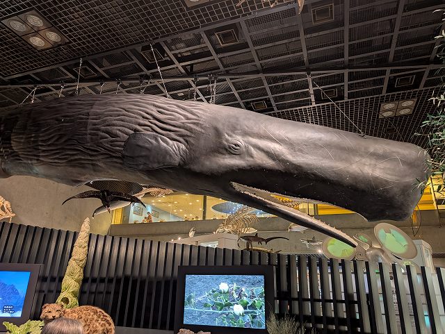 全長30mのシロナガスクジラが潜航を開始する実物大模型。