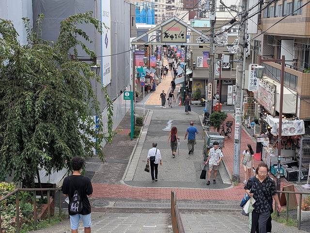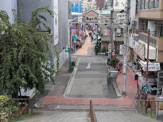階段の上から撮った「谷中ぎんざ商店街」入口の写真。