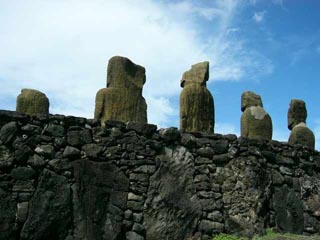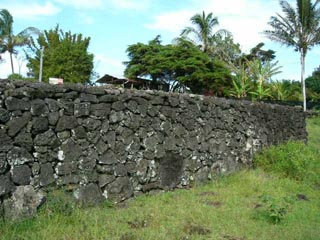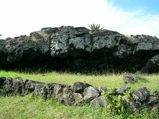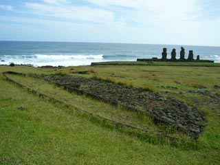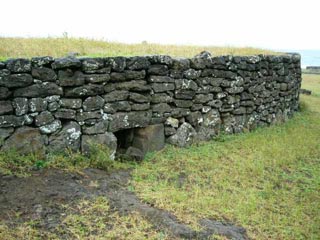 「ボートハウス」と呼ばれる。楕円形に 組まれた石には穴が開けられており、 そこに竹などを刺して柱とし、 葦などを使って屋根や壁を造った。 ビッシリと石が敷きつめられている 部分は庭。楕円の長さは 10メートル以上もある。 |