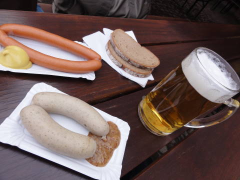 ドイツ・レーマー広場と言えばこれ! ビールとフランクフルト! フランスではあまり冷たいビールが飲めなかったので、ジョッキでグビグビ飲むのを楽しみにしていたのですが・・・。