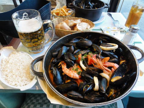 左がムール貝withシーフード&ライス沿え@21.6EUR、右がディジョン風ムール貝(マスタード味)&フレンチフライ@19.5EUR、オリジナルビールが500ccで7.8EUR。
