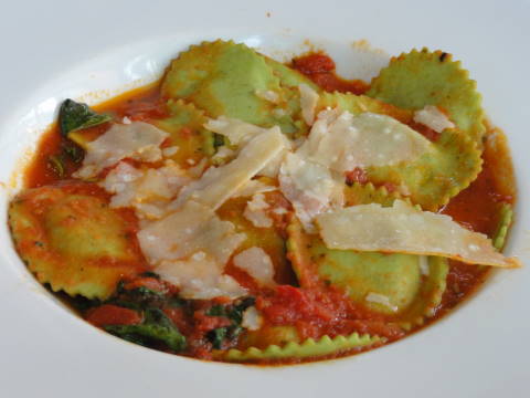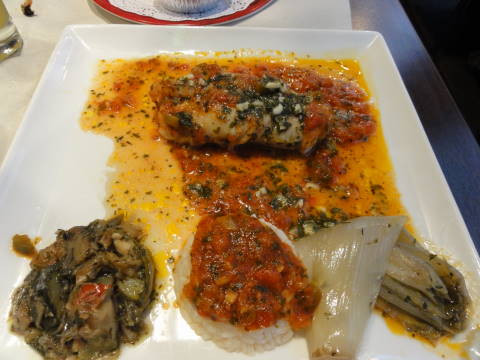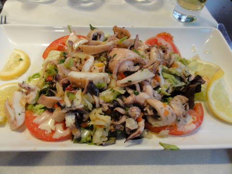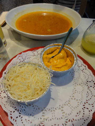 まず前菜として魚のダシで作ったスープが出され、これにおろしニンニクやチーズを乗せたパンを浮かべて食べます。