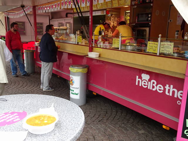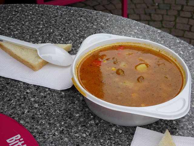 一角の屋台で売られていた、ジャガイモやトウモロコシ等の野菜がタップリ入ったスープ。