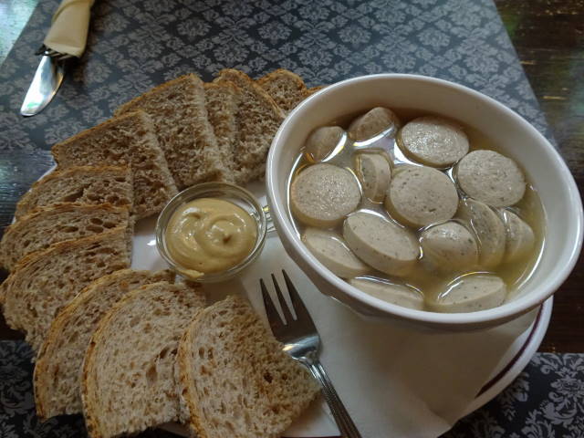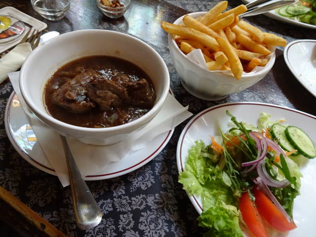 アントワープのソーセージ(Gezoden worst・Antwerpse specialiteir)@8.5EURと、フランダース風カルボナード(Vlaamse Karbonaden。牛肉をビールで煮込んだ郷土料理)@16.5EUR。