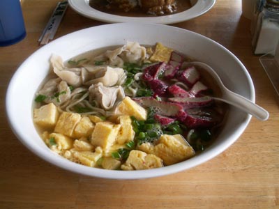 右:サイ・ミン。当店人気の麺料理。トッピングはチャーシューとワンタンと