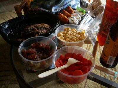 玉子サラダ、人参サラダ、巻き寿司などを購入。もちろんローカル・ビールも!