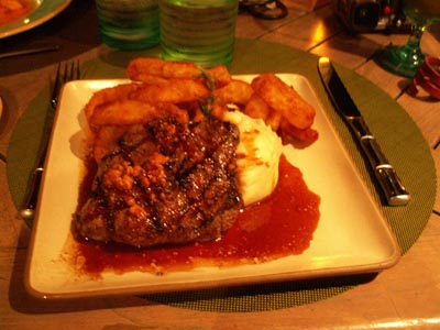 8oz(約230グラム)ステーキとオニオン・リング&マッシュド・ポテト。