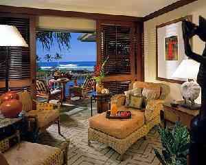 ひとり107330円(往復ホノルル経由)。米系航空会社も似たような金額。 ホテルはフォーシーズンズに直接予約を入れるのが最も安く、 オーシャンビューの部屋が1泊US$775なので、4泊でUS$3100。これに税金その他を 加えるとUS$3462。日本円に換算すると1泊103850円! 4泊で415400円!! ←オーシャンビューの室内と窓から見える海。 写真はフォーシーズンズのWebSiteより拝借。 |