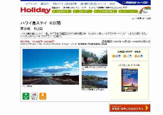 一人あたり312430円。 次にパッケージツアーを検索。各社とも310000〜320000円(諸経費を含む)と、 個人手配した場合とほとんど変わらない。それならマイレージを 考えて個人手配にするか・・・と思っていたら、ナント近畿日本ツーリストに、 一人260320円のツアーを発見! |