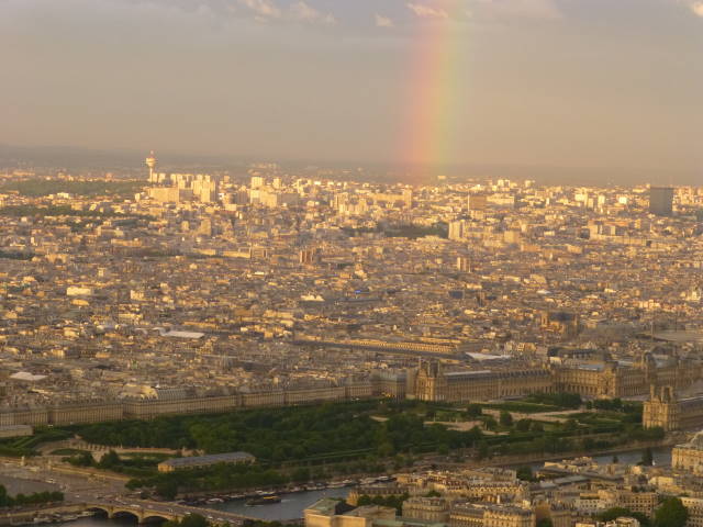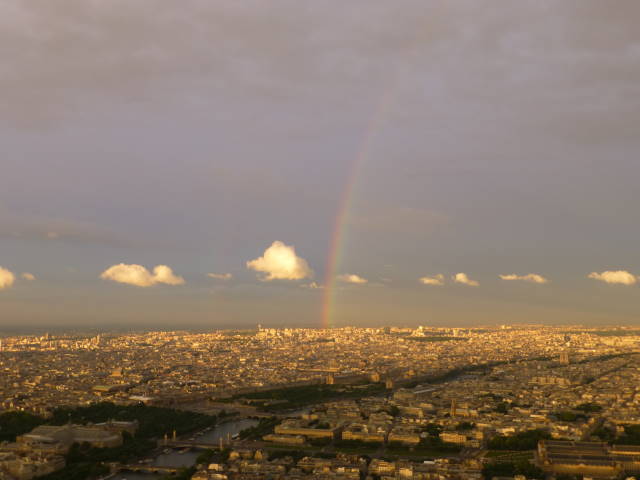 展望台に着いたら、運良く虹が見えました! 真ん中の写真中央下の横に長い建物がルーヴル宮殿(Palais du Louvre)、